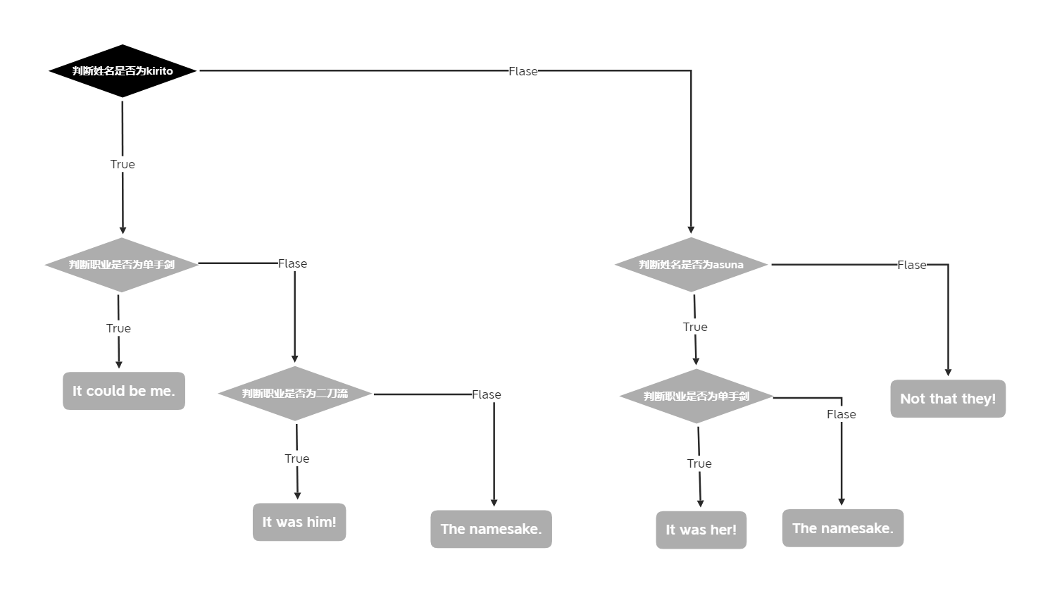 python中的条件判断 最后更新时间:2020年12月31日 #### 条件判断 ##### - if …else…else…语句 条件判断是通过一条或多条判断语句的执行结果(True 或者 False)来决定执行的代码块。在Python 语法中,使用 if、elif 和 else 三个关键字来进行条件判断。其格式为: ```python if conditions1: # 判断条件conditions1是否为True pass # 如果conditions1为True时执行的语句 """如果conditions1为Flase""" elif conditions2: # 判断条件conditions2是否为True pass # 如果conditions2为True时执行的语句 else: # 条件conditions都为Flase pass # 如果条件conditions都为Flase时执行的语句 ``` 条件判断使用原则: - 每个条件后面要使用 冒号 作为 判断行的结尾,表示接下来是 满足条件(结果为True)后要执行的语句块。 - 除了 if 分支 必须有,elif 和 else 分支都可以根据情况 省略。 - 使用 缩进 来 划分语句块,相同缩进数的语句在一起组成一个语句块。 - 顺序判断每一个分支,任何一个分支首先被命中并执行,则其后面的所有分支被忽略,直接跳过! - 可以有多个 elif ,但只能有一个 else - 在 Python 中 没有 switch – case 语句。  ##### 条件判断嵌套 if...elif...else 语句可以嵌套,也就是把 if...elif...else 结构放在另外一个 if...elif...else 结构中。 示例:  ```python print("——老爷信息认证——") name = input("请输入姓名:") occ = input("请输入职业:") if name == "kirito": if occ == "单手剑": print("It could be me.") elif occ == "二刀流": print("It was him!") else: print("The namesake.") elif name == "asuna": if occ == "单手剑": print("It was her!") else: print("The namesake.") else: print("Not that they!") print("———认证结束———") ```