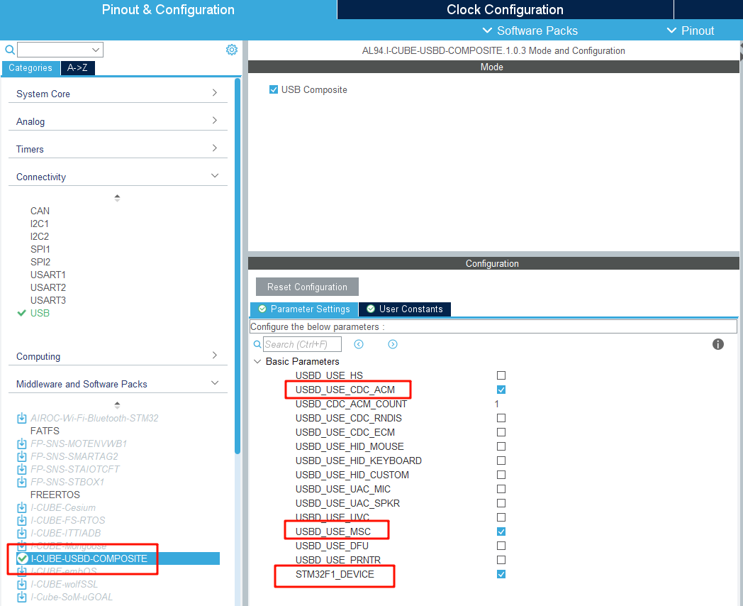 [搬运]实现 USB Composite 设备:在同一接口上模拟多个设备(含 FatFS U盘) 最后更新时间:2026年02月12日 ## 原文链接 https://blog.orangetime.top/2024/10/27/mcu/USB-Composite/ ## 原文 仓库:https://github.com/alambe94/I-CUBE-USBD-Composite 参考:https://blog.csdn.net/u012936480/article/details/137411833 在嵌入式开发中,USB 是一个非常重要的外设接口,它不仅可以用来调试、传输数据,还能为产品增加多样化的功能体验;而如果你希望在一个 USB 接口上同时实现多个设备功能,比如既能当串口调试工具、又能当 U 盘存储设备,甚至还能充当 HID 控制器,那你就需要掌握 USB Composite(复合设备) 的实现方式; 本篇博客将结合前文实现的 FatFS 文件系统功能,进一步介绍如何在 STM32 平台上实现 USB Composite 设备;我们将以 U盘 + 虚拟串口(CDC) 为例,完整讲解如何配置多个接口;通过这一实践,你将掌握一线多用的 USB 技巧,为你的嵌入式设备赋予更多“身份”和可能性; 本文采用了 GitHub 上一个开源项目(I-CUBE-USBD-Composite)作为基础,该项目已经实现了 USB Composite 的关键功能;我们基于它,以简单快捷的方式完成了 U 盘 + CDC 的复合设备实现; ### 文件下载 [.I-CUBE-USBD-COMPOSITE.zip](https://yidaimingjvn.xyz/usr/uploads/2026/02/3264526182.png ".I-CUBE-USBD-COMPOSITE.zip") 链接中是一个png文件,修改为zip可以解压。 解压后有个pkg文件,但是这个文件并不是给 MDK 使用的,而是给 STM32CubeMX 使用的,我们需要在 STM32CubeMX 中导入这个文件,作为组件库引入我们的工程中; 导入文件步骤如下:   ### 工程引入 导入完成之后,我们还需要在 CubeMX 中勾选这个组件库,选择所需的功能 ,如下:   其中,Core 是必须勾选的,如果你要同时使用 CDC 和 U 盘,那么不仅 CDC_ACM 和 MSC_BOT 都需要勾选,而且还必须勾选 COMPISITE,否则 USB Composite 功能将无法正常使用; 在导入组件库之后,我们还需要在 CubeMX 中配置一下 USB 相关的配置,如下: - 配置 USB 外设的中断,否则 USB 外设将无法正常工作  - 配置组件库  博客使用 F103 作为例子,所以还需要选择最后一项; ### 代码修改 配置好之后,我们直接使用 CubeMX 生成代码即可,代码中需要修改的地方不多,主要是初始化和对应 USB 功能的逻辑,如下: #### 引入工程 ```c #include "usb_device.h" #include "usbd_cdc_acm_if.h" int main(void) { ... MX_USB_DEVICE_Init(); ... while(1) { ... } } ``` #### 功能逻辑 每一个 USB 功能都对应一个文件,比如 CDC 功能对应的是 usbd_cdc_acm_if.c,我们只需要在对应的文件中添加我们需要的逻辑即可,因为在之前的博客中已经实现了 FatFS 文件系统,所以我们今天主要将重点放在 CDC 与 U 盘的处理逻辑上; #### CDC 串口 CDC(Communication Device Class)是一种虚拟串口接口,库文件中已经封装好了基本的收发逻辑:发送数据时直接调用发送函数,接收到数据时则会自动调用接收回调函数; 听起来一切都很完美,但这背后其实还隐藏着一个关键问题; 答案是:理解 USB 的传输机制,特别是数据包的处理方式; USB 在底层按“包(Packet)”传输,CDC 使用的传输类型为 Bulk(批量传输),**每个端点的最大数据包大小(Max Packet Size)**对于全速设备通常为 64 字节;因此,大于 64 字节的数据会被分为多个包发送;这意味着: 如果我们发送的数据长度小于等于 64 字节,可以一包发完; 如果发送的数据长度大于 64 字节,则需要拆分为多个数据包进行分批发送; 在发送方面,库通常已经封装好了自动拆包的逻辑;我们调用发送函数时,只需要传入需要发送的缓冲区和长度,不必关心包的边界或分段细节; 接收就没那么轻松了; 虽然 USB 主机会自动将数据拆分为多个包发送,但在设备端的接收回调函数中,我们每次只能获取一包数据,这意味着:如果一条完整的数据大于 64 字节,必须手动将这些数据包拼接起来,然后再统一处理; 那么,我们该如何判断数据是否接收完毕? 我的做法是引入了一个“接收超时判断”机制;每当接收到一包数据时,就刷新一次超时计时器;如果在某个预设时间内没有再接收到新的数据包,就说明数据应该已经接收完毕,可以进行处理了(算是串口空闲的简单实现思路); 这种方法简单实用,特别适合一些非实时、包长度不确定的串口协议; 如果你希望更稳妥地判断数据边界,也可以考虑使用协议头尾、长度字段等方式进行辅助判断;但在简单应用中,“超时判断法”是一个很实用的起点; 头文件 usbd_cdc_acm_if.h 中需要添加以下内容: ```c // 相关宏定义 #define CDC_RX_BUF_SIZE 512 // 缓冲区大小,根据实际需求调整 #define CDC_TIMEOUT_MS 6 // 超过 6ms 没数据,认为一帧结束,结合实际一包发送的时间调整 // 相关函数声明 void process_usb_frame(uint8_t* data, uint16_t len); // 处理接收到的 USB 数据帧 void check_usb_timeout(void); // 检测 USB 接收超时,超时后调用 process_usb_frame ``` 源文件 usbd_cdc_acm_if.c 中需要添加以下内容: ```c // 相关变量定义 uint8_t cdc_rx_buffer[CDC_RX_BUF_SIZE]; uint16_t cdc_rx_index = 0; uint32_t cdc_last_recv_tick = 0; uint8_t cdc_receiving = 0; // 修改 CDC_Receive 函数 static int8_t CDC_Receive(uint8_t cdc_ch, uint8_t *Buf, uint32_t *Len) { /* USER CODE BEGIN 6 */ // 拼接到总缓冲区 if(cdc_rx_index + *Len < CDC_RX_BUF_SIZE) { memcpy(&cdc_rx_buffer[cdc_rx_index], Buf, *Len); cdc_rx_index += *Len; cdc_last_recv_tick = HAL_GetTick(); // 更新时间戳 cdc_receiving = 1; } else { // 缓冲区溢出,复位 cdc_rx_index = 0; cdc_receiving = 0; } USBD_CDC_SetRxBuffer(cdc_ch, &hUsbDevice, &Buf[0]); USBD_CDC_ReceivePacket(cdc_ch, &hUsbDevice); return (USBD_OK); /* 